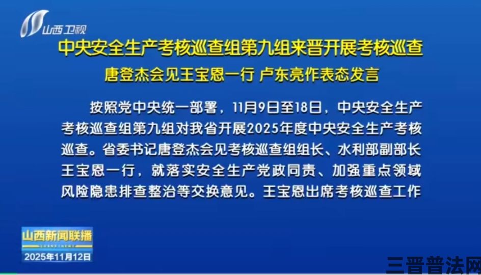 按照党中央统一部署,11月9日至18日,中央安全生产考核巡查组第九组对我省开展2025年度中央安全生产考核巡查。省委书记唐登杰会见考核巡查组组长、水利部副部长王宝恩一行,就落实安全生产党政同责、加强重点领域风险隐患排查整治等交换意见。王宝恩出席考核巡查工作座谈会并讲话,省长卢东亮作表态发言,省委常委、常务副省长董晓宇汇报有关工作情况。 王宝恩指出,今年是首次以党中央名义开展安全生产考核巡查,将重点核查党政领导干部责任制落实情况、有关部门安全生产履职情况、安全生产治本攻坚三年行动推进情况、事故多发地区和行业领域、群众反映和职工报告的问题隐患线索,通过座谈问询、明查暗访、调阅资料、个别谈话、隐患曝光、专家指导服务等方式,客观真实反映有关工作实效。严格落实中央整治形式主义为基层减负要求,注重提高考核巡查质效,对重大事故隐患和问题严肃追责问责。希望山西省以此次考核巡查为契机,进一步压紧压实各方责任,持续改进和加强安全生产工作,坚决防范遏制重特大事故发生,以高水平安全保障高质量发展。 卢东亮表示,此次考核巡查是对我省安全生产工作的一次全面检验。各地各部门要深入贯彻习近平总书记关于安全生产的重要论述和考察山西重要讲话重要指示精神,更好统筹发展和安全,坚决扛牢安全生产政治责任,把事前预防摆在更加突出位置,深入推进治本攻坚,扎实抓好重点领域安全生产和防灾减灾救灾各项工作,结合“十五五”规划编制,全面提升全省本质安全整体水平。全力支持配合考核巡查组开展工作,对指出的问题隐患诚恳接受、照单全收、立行立改,强化标本兼治,切实提高安全生产治理能力和水平,努力以山西一域安全为全国大局稳定多作贡献。 座谈会上,与会人员观看了全国前三季度明查暗访发现典型问题隐患警示片。考核巡查组第九组有关成员,省安委会有关成员单位负责同志参加会议。